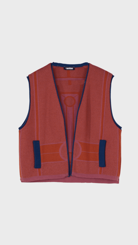 Meet wolvis vests in two distinct variations: a thinner, lighter version in a 2-coloured knitted jacquard, and a thicker version featuring a captivating 4-coloured knitted jacquard. Crafted with the softest merino, these vests offer both comfort and vibrancy, making them perfect for wearing directly on your skin or layering over a sweater. Elevate your outfit effortlessly with wolvis vests.