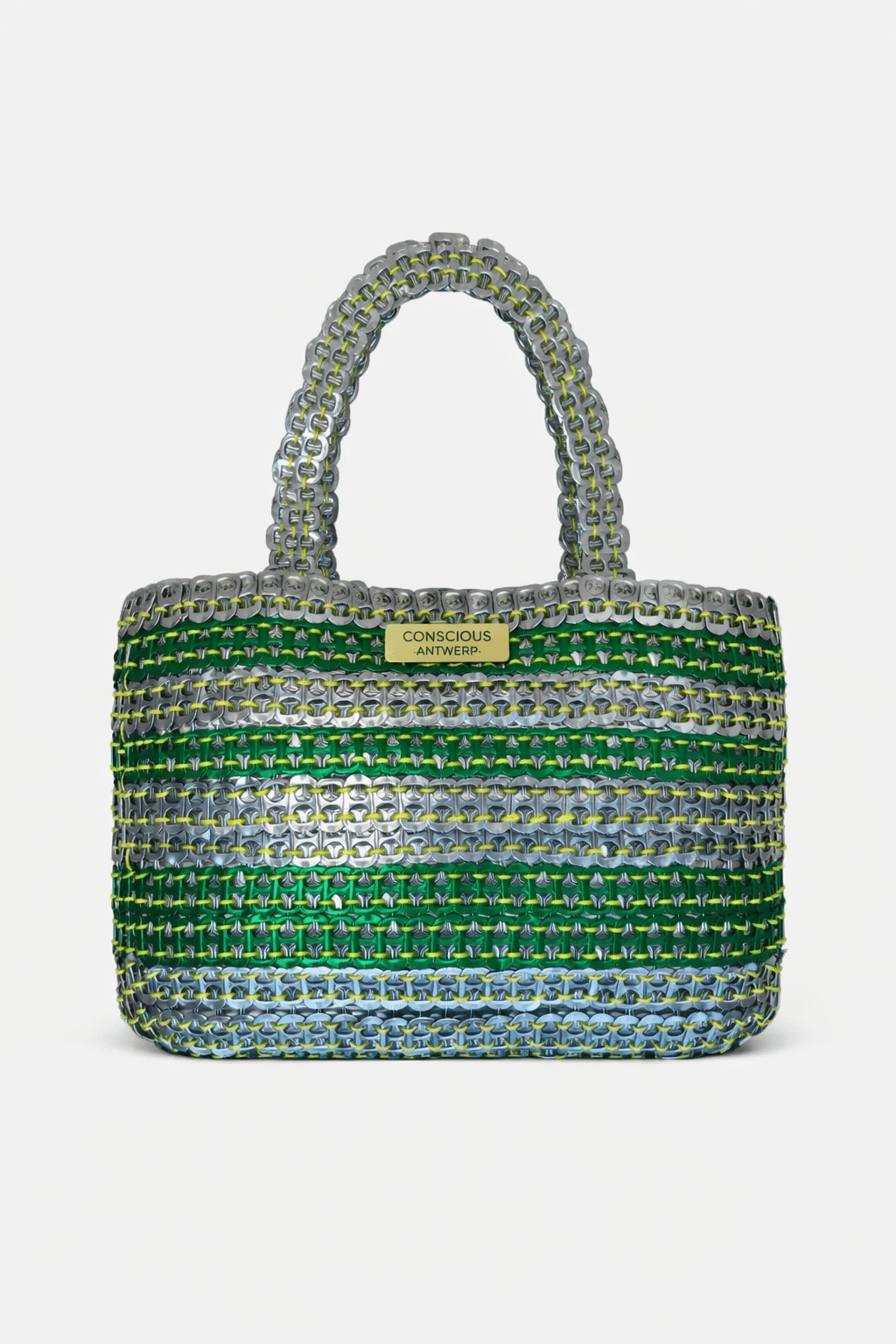 Metallic Medium Tote by Conscious Antwerp is exclusive statement piece. These bags are handmade by Jef, a former alcoholic from Antwerp, who now works as a volunteer for AA(Alcoholics Anonimous). The organisation helped him to become sober 22 years ago and now he tries to help the organisation and other AA clients as much a he can. To raise money for AA, Jef started to create these beautiful bags from can clips. He asked people in his environment to save and collect as many can clips for him as possible and over the years he has collected enough clips to create a collection of beautiful bags. By purchasing and reselling these handmade bags from Jef, CONSCIOUS ANTWERP tries to support the good work from Jef for AA.