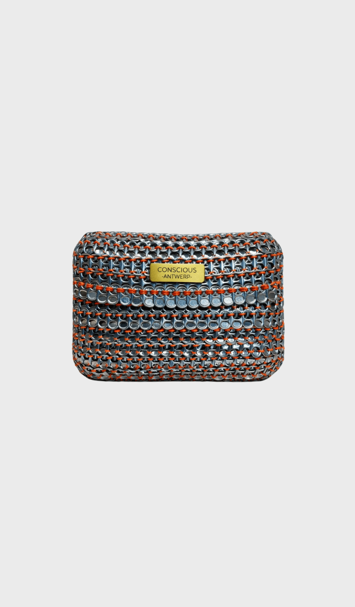 Metallic Small Crossbody by Conscious Antwerp is exclusive statement piece. These bags are handmade by Jef, a former alcoholic from Antwerp, who now works as a volunteer for AA(Alcoholics Anonimous). The organisation helped him to become sober 22 years ago and now he tries to help the organisation and other AA clients as much a he can. To raise money for AA, Jef started to create these beautiful bags from can clips. He asked people in his environment to save and collect as many can clips for him as possible and over the years he has collected enough clips to create a collection of beautiful bags. By purchasing and reselling these handmade bags from Jef, CONSCIOUS ANTWERP tries to support the good work from Jef for AA.
