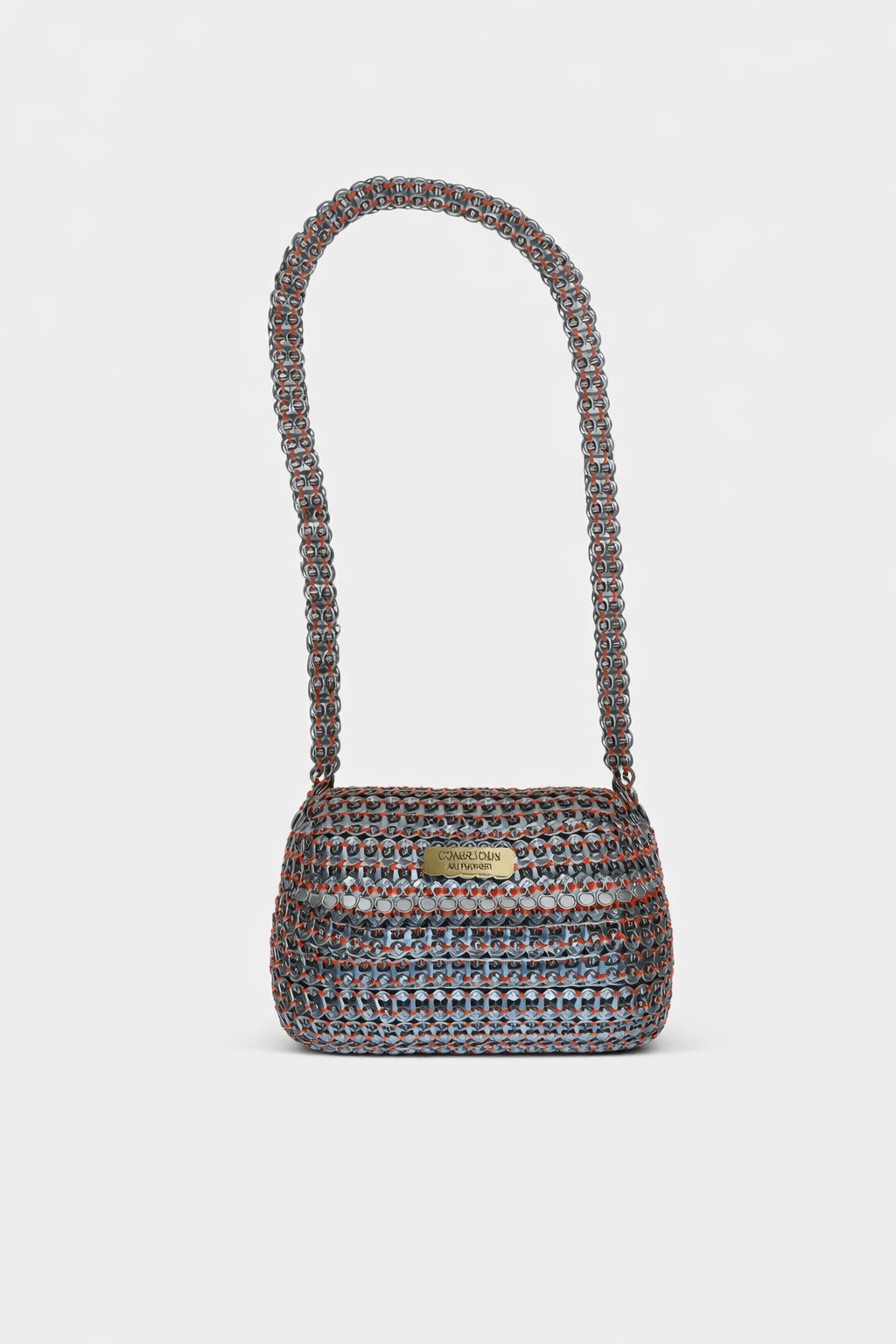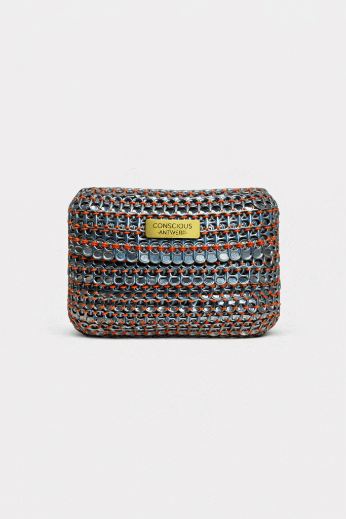 Metallic Small Crossbody by Conscious Antwerp is exclusive statement piece. These bags are handmade by Jef, a former alcoholic from Antwerp, who now works as a volunteer for AA(Alcoholics Anonimous). The organisation helped him to become sober 22 years ago and now he tries to help the organisation and other AA clients as much a he can. To raise money for AA, Jef started to create these beautiful bags from can clips. He asked people in his environment to save and collect as many can clips for him as possible and over the years he has collected enough clips to create a collection of beautiful bags. By purchasing and reselling these handmade bags from Jef, CONSCIOUS ANTWERP tries to support the good work from Jef for AA.
