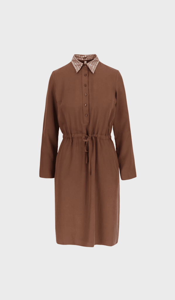 This dress is made in a mokka tencel. The dress has a tunnel in the waist, pockets and a reversible and removable collar. The reverse side of the collar is made in a pink dots EcoVero.