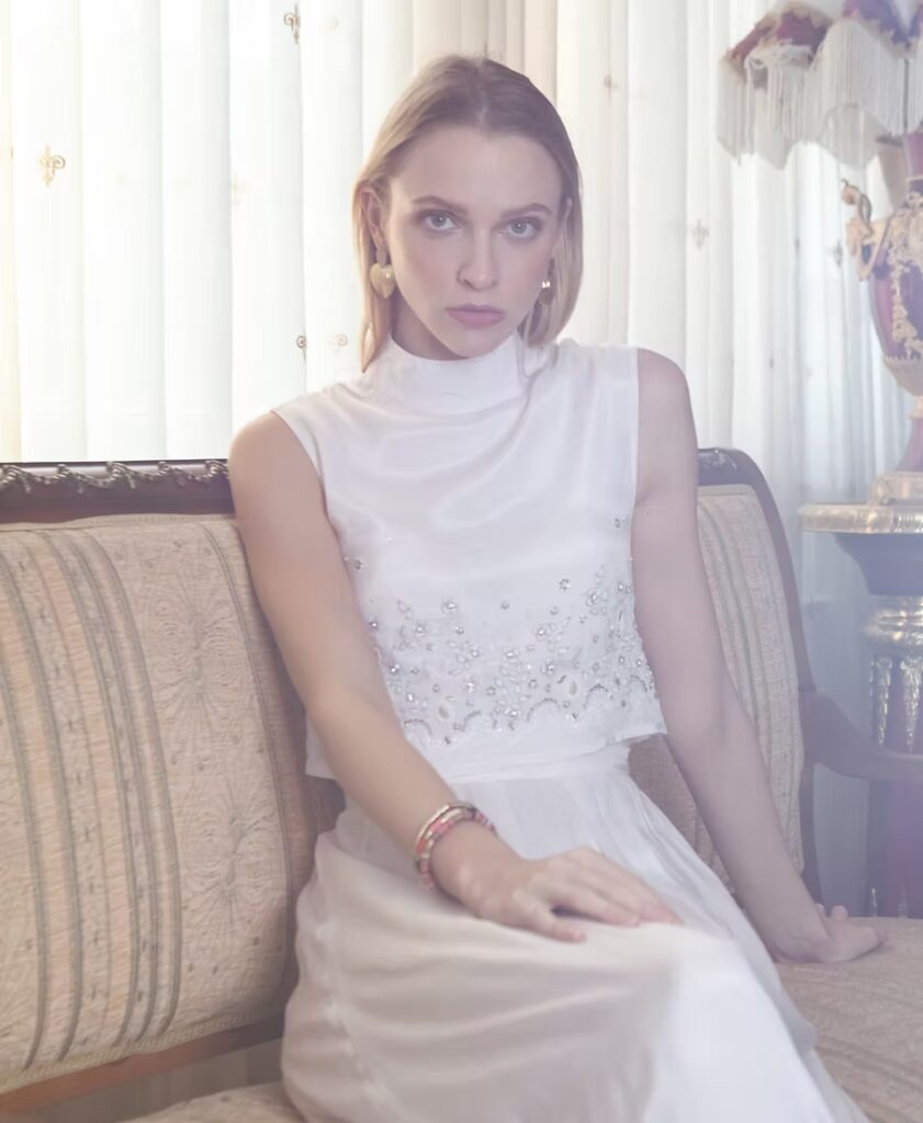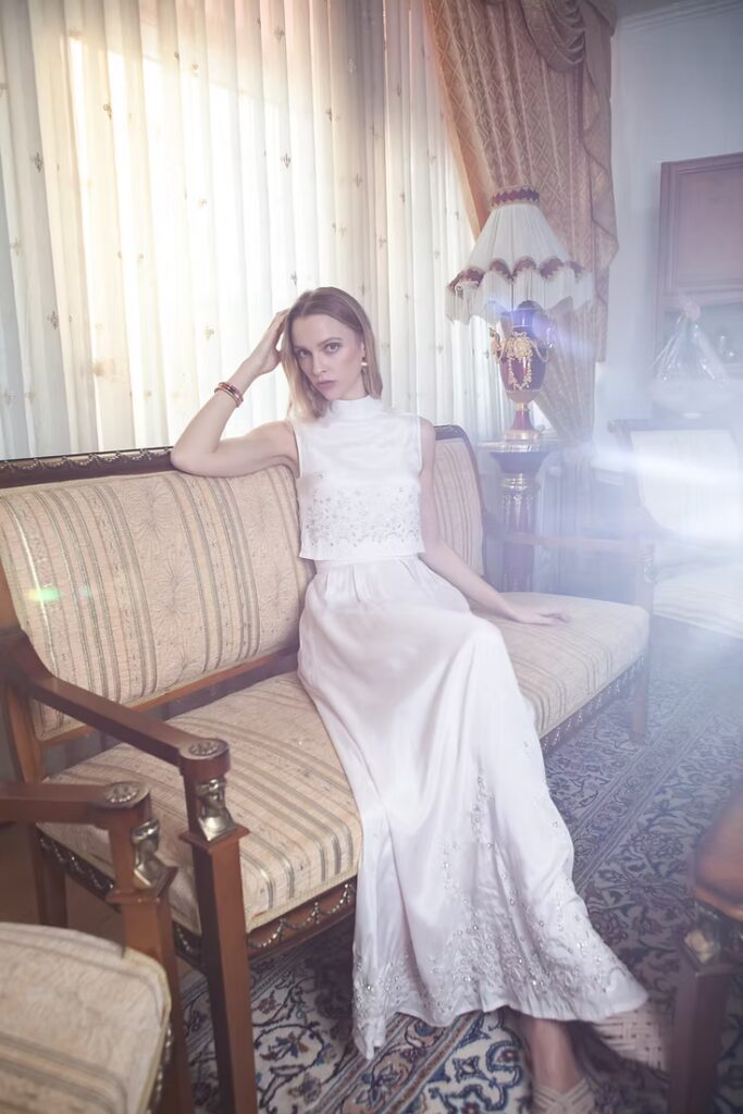 NILOOFAR, the glamorous maxi dress, features hand embroidery and embellished handwork. NILOOFAR has a two-piece look. The bodice crop top has a high neck and is connected to the high-waist skirt. It is fully lined and has an invisible zip at the back.
