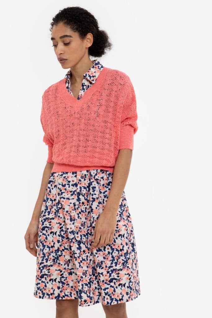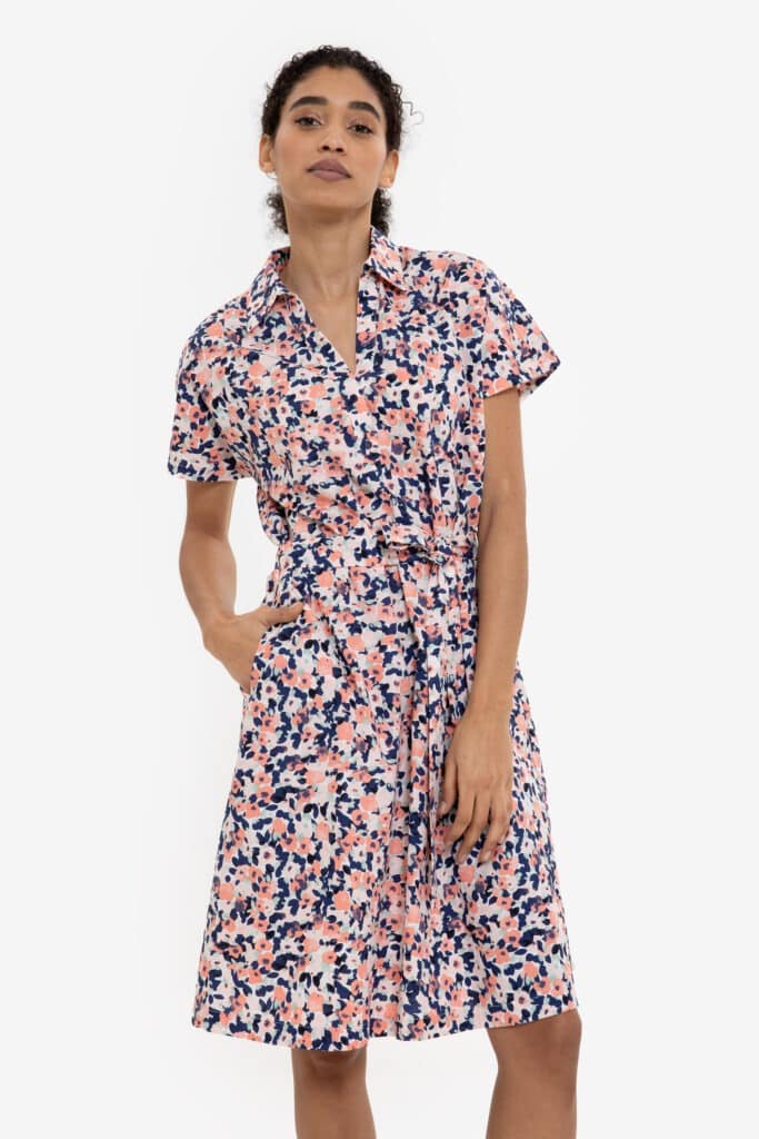 The Olivia dress in cobalt blue and flamingo pink is a flowy midi dress with short sleeves and a belt.