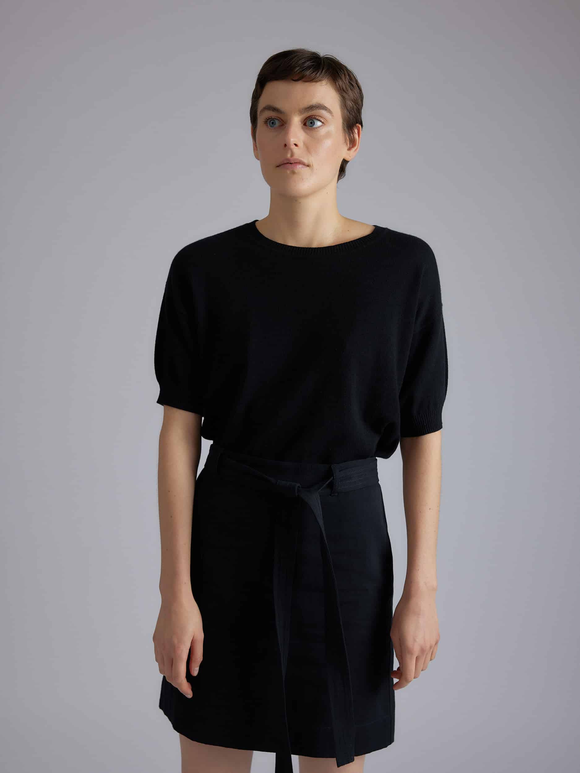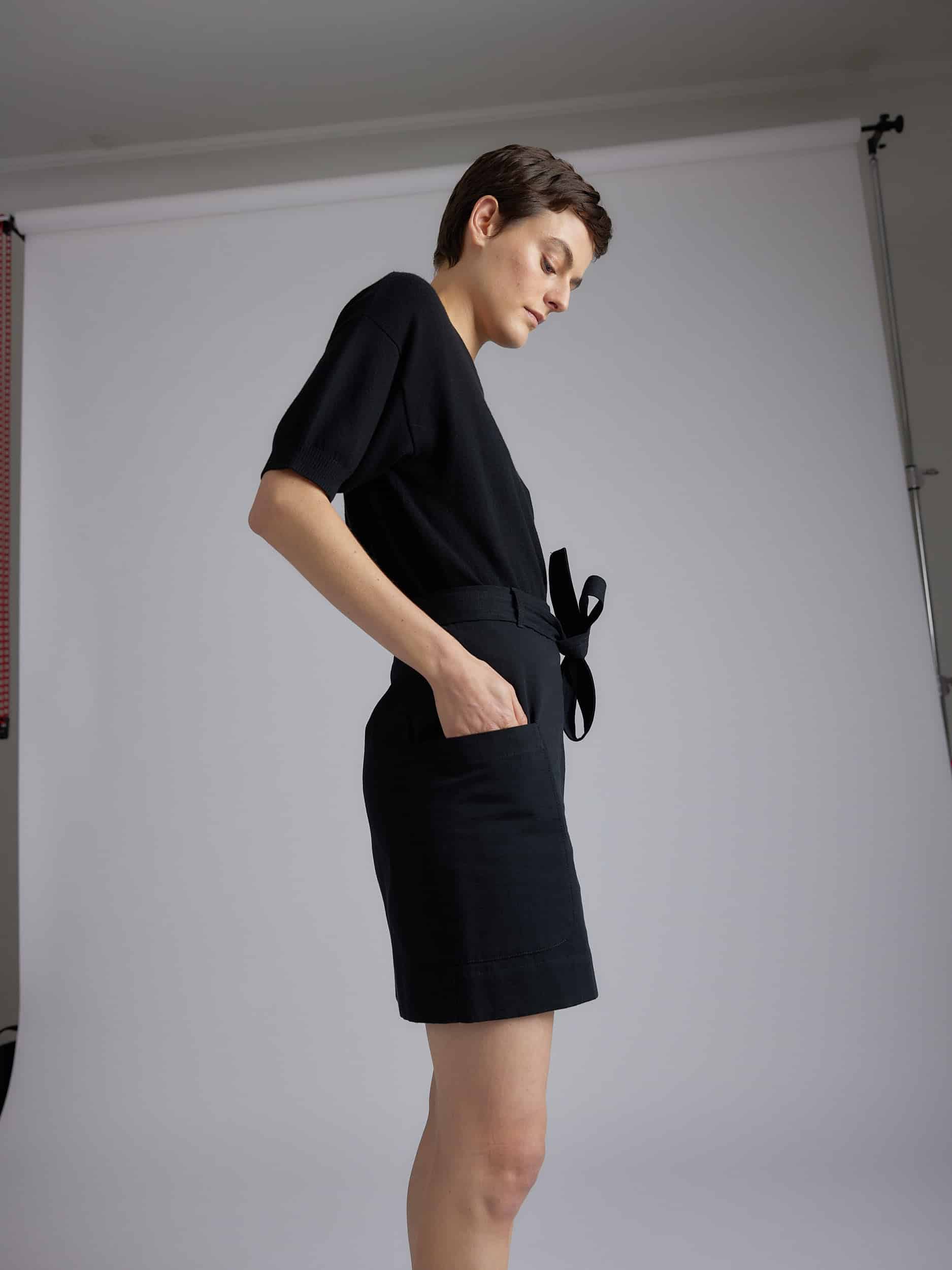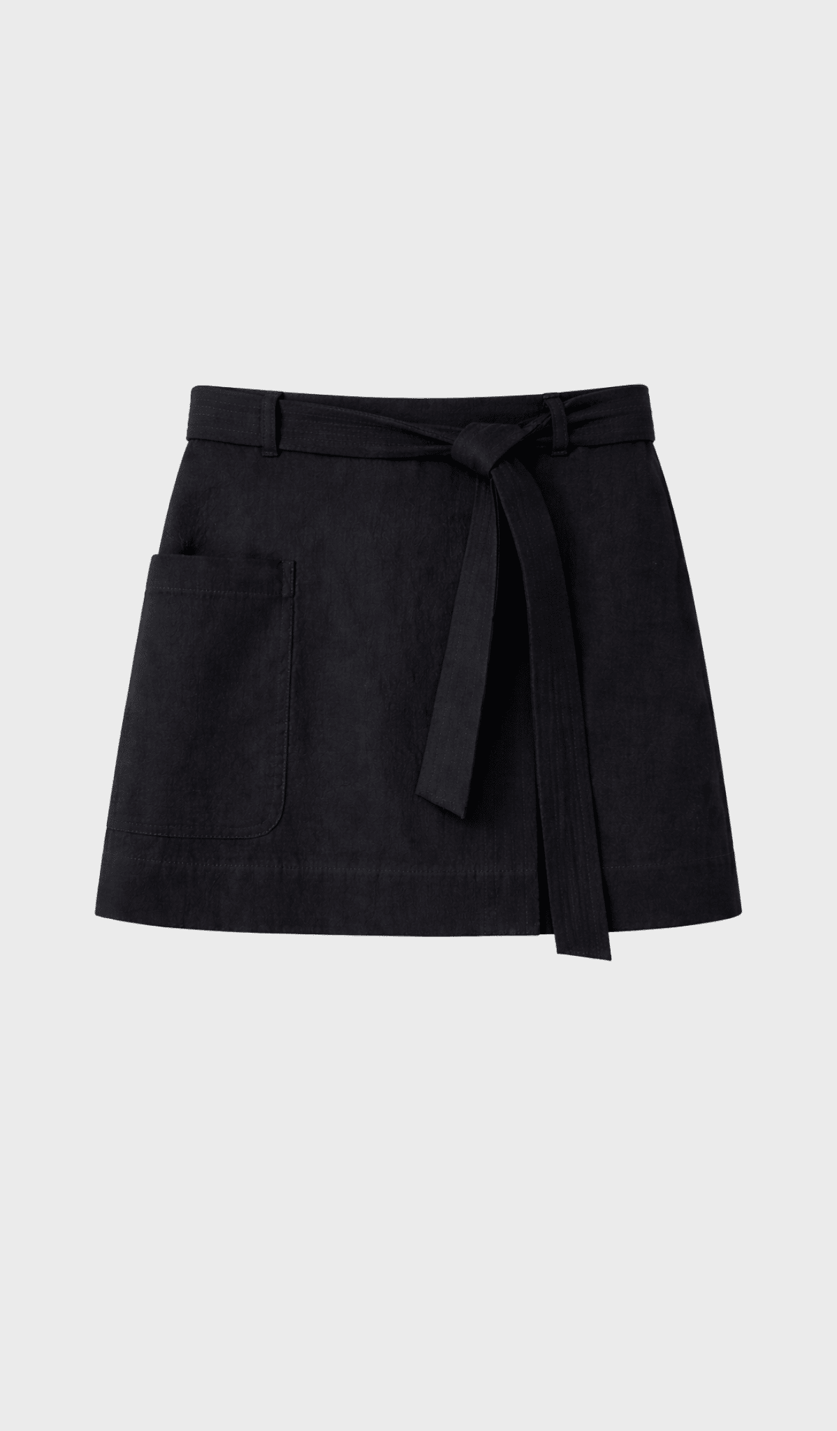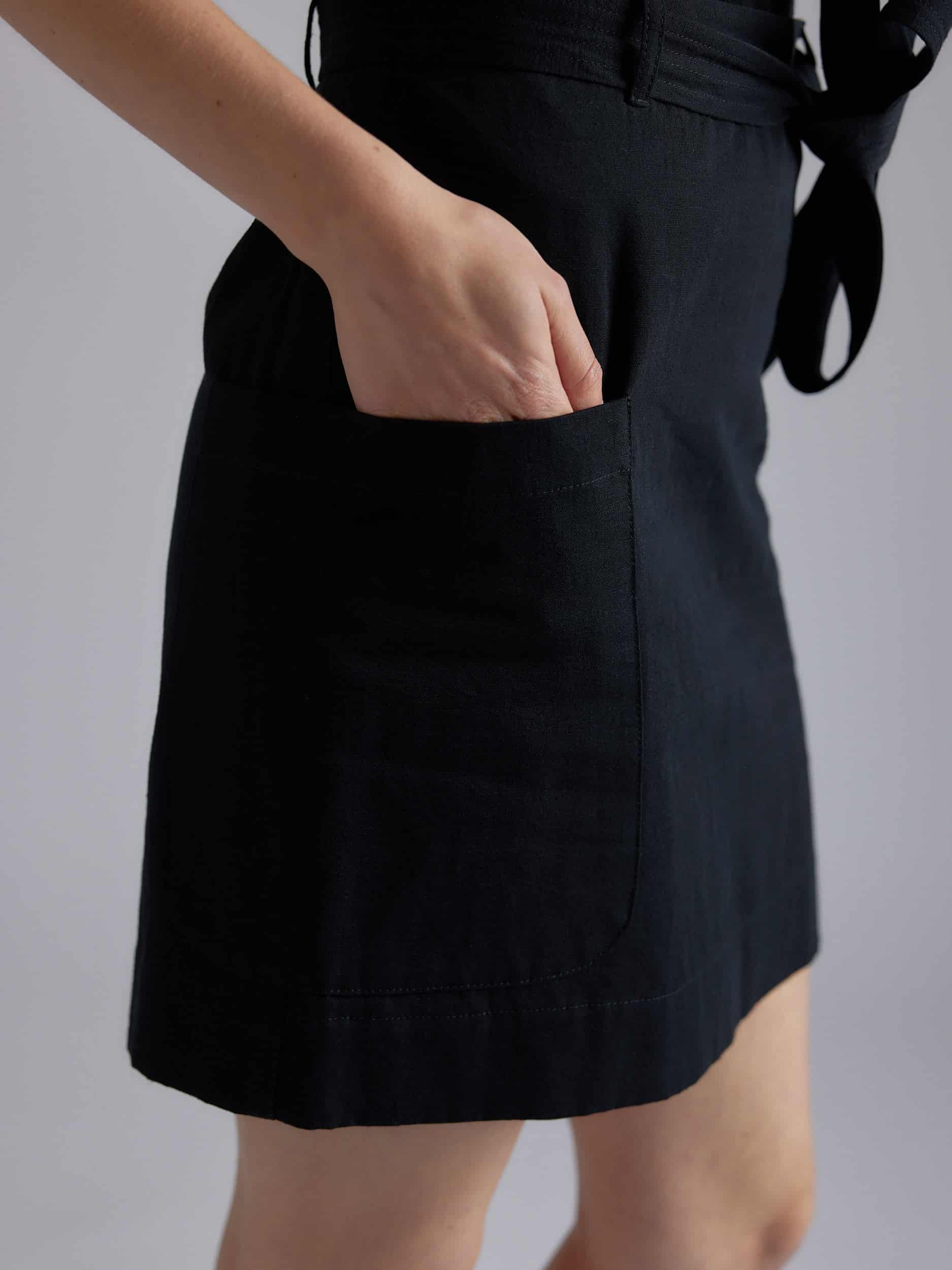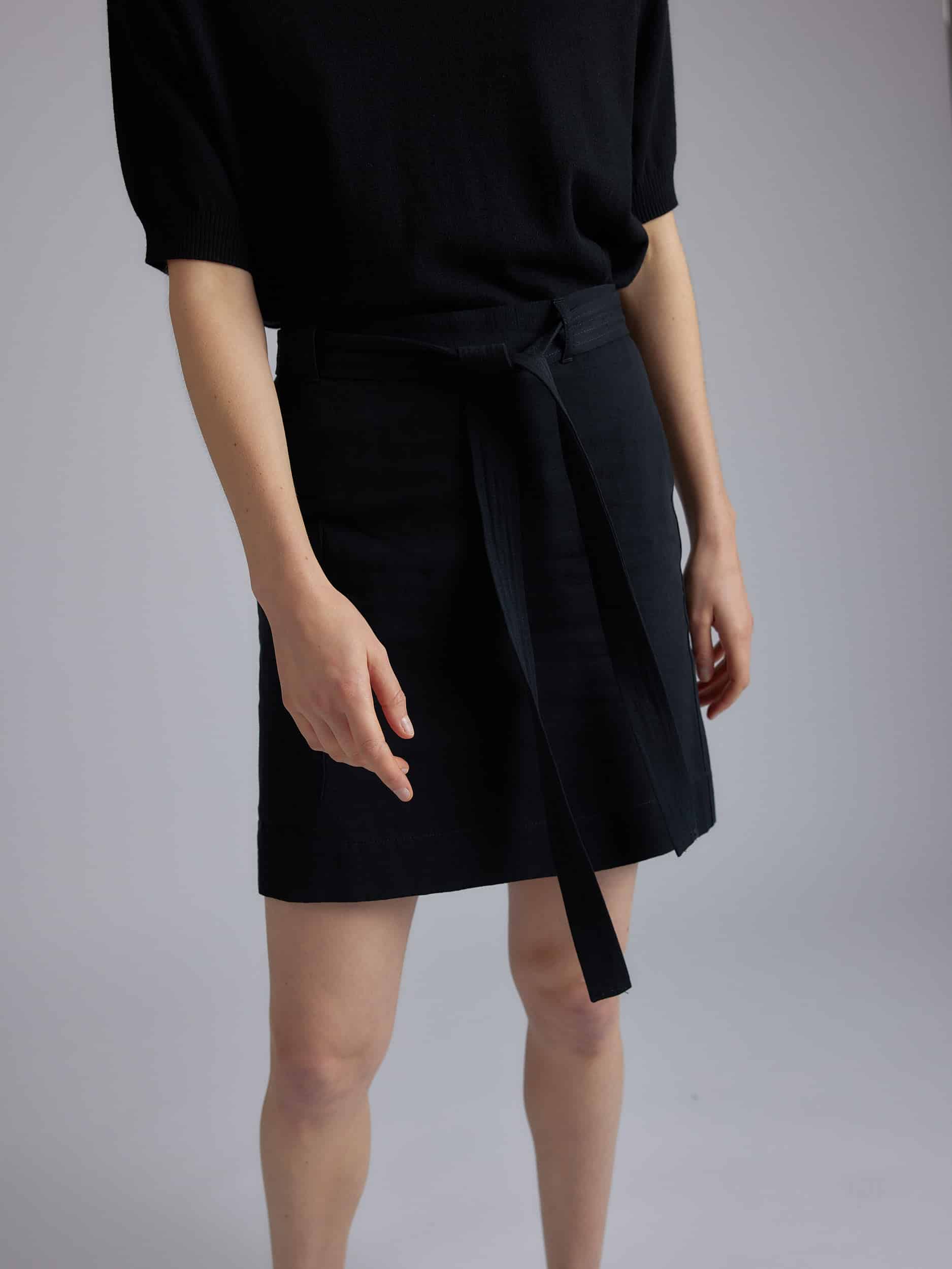 Mini skirt with a big side pocket and a self fabric belt. Button and zip closure at the back.