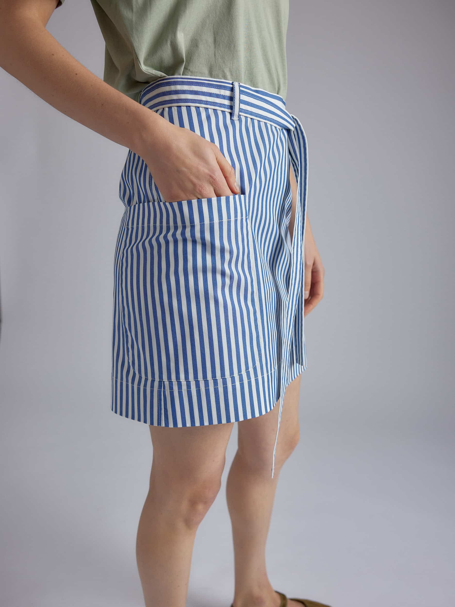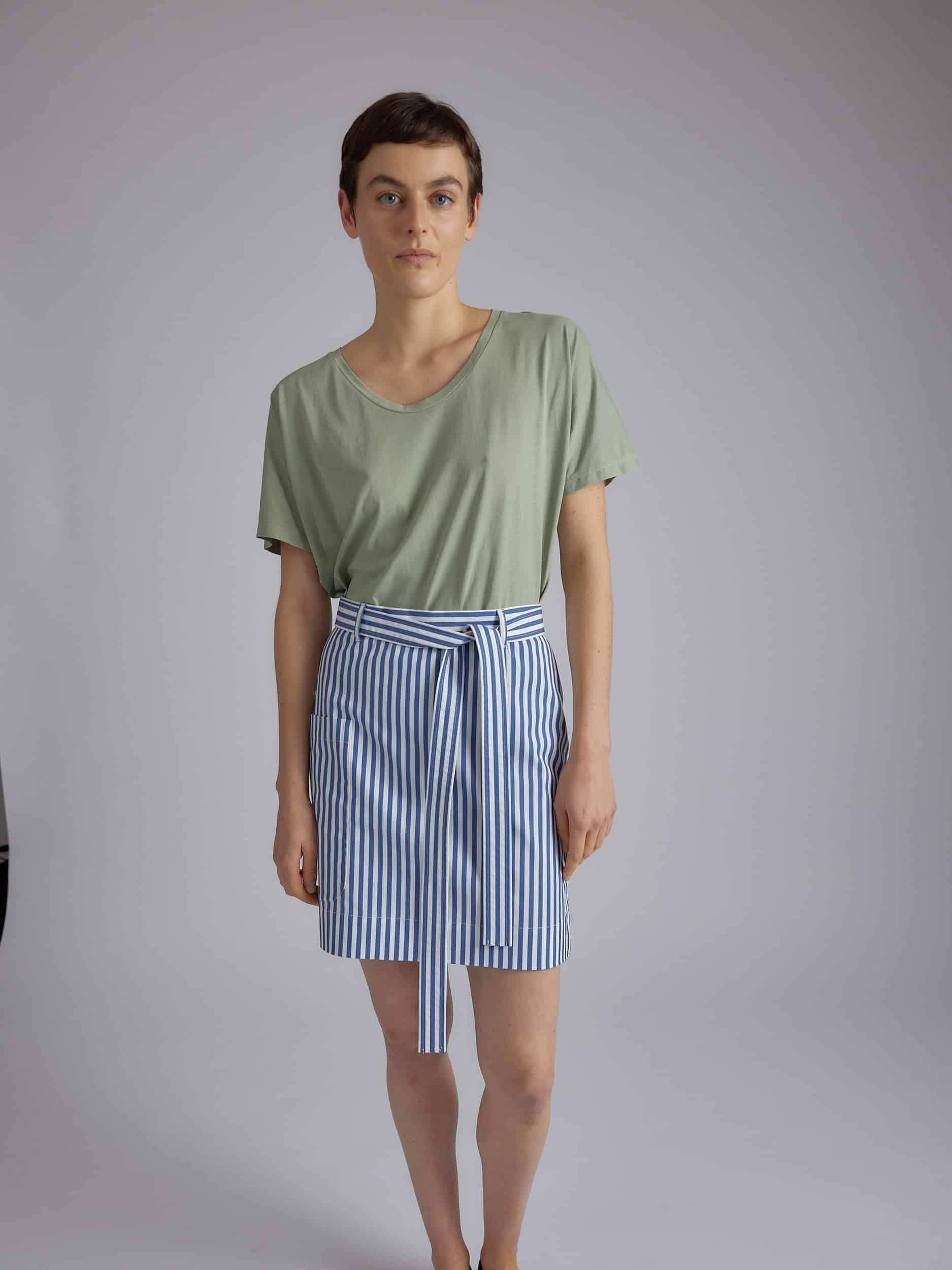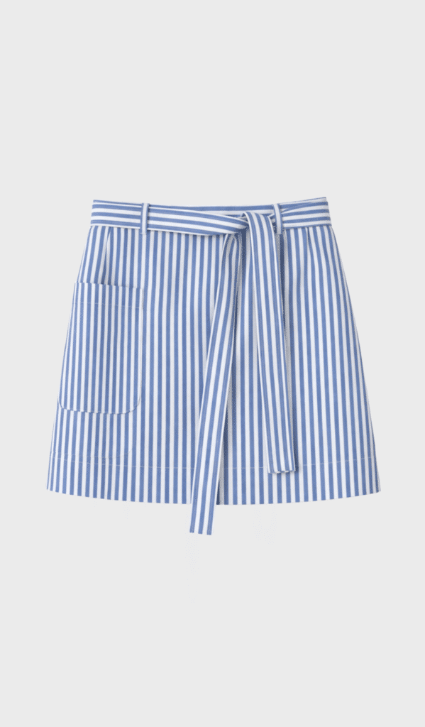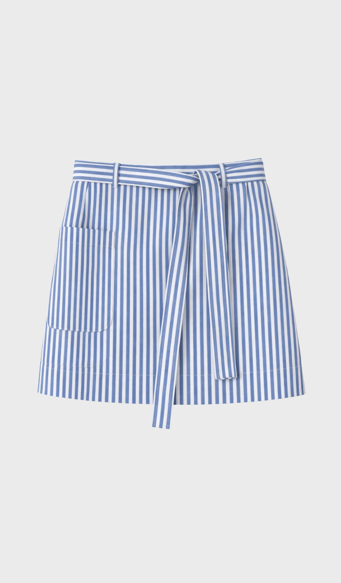 Mini skirt with a big side pocket and a self fabric belt. Button and zip closure at the back.