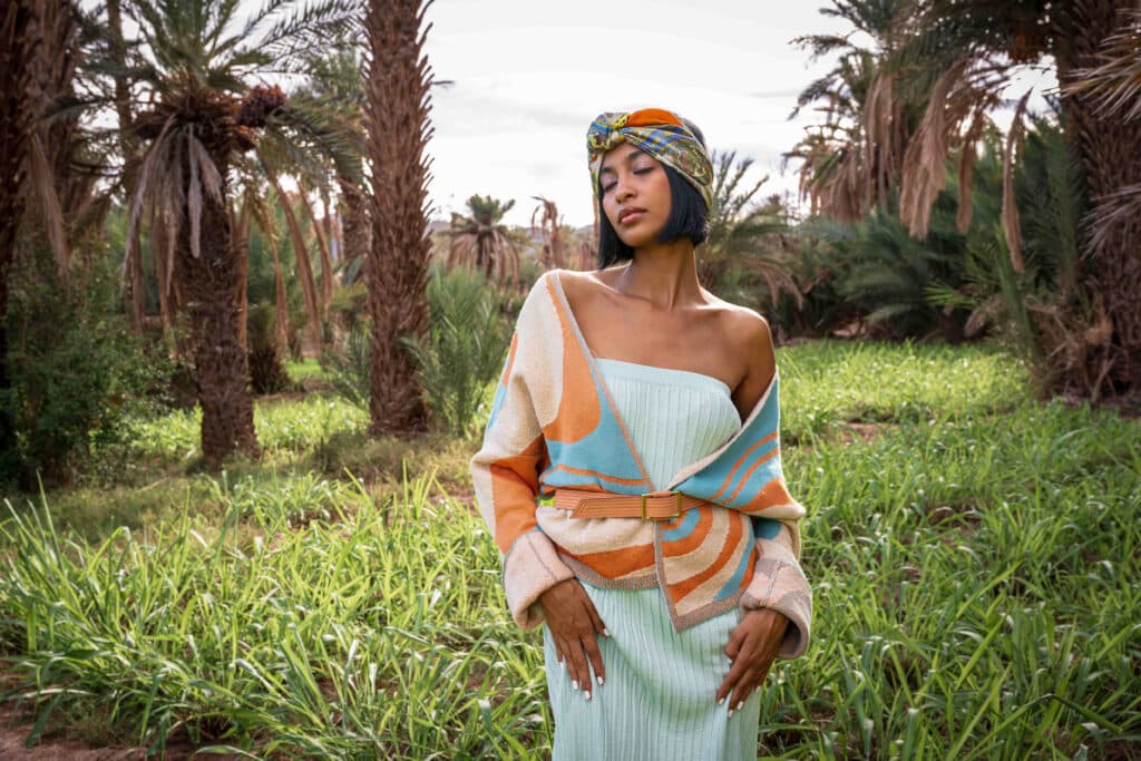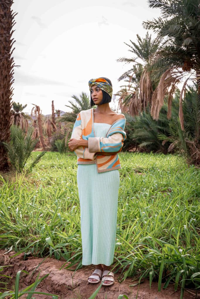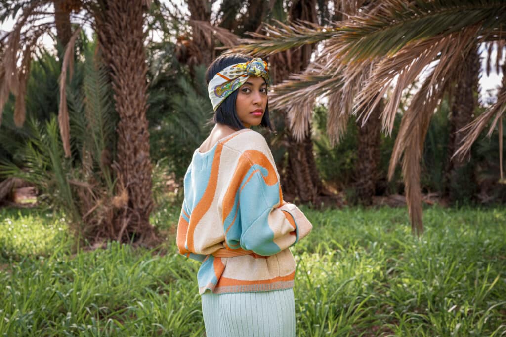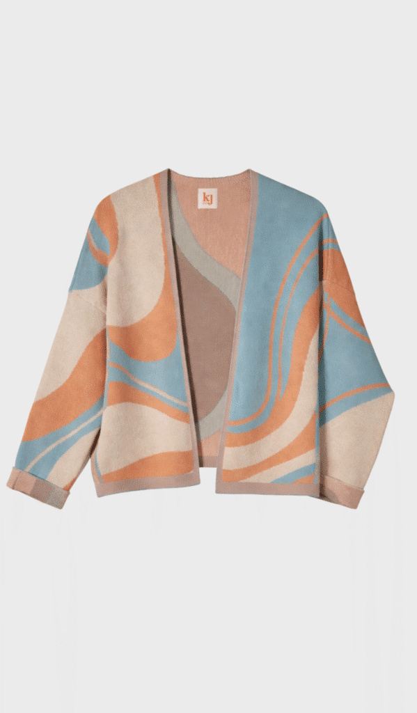 Short knitted vest with long sleeves in a jacquard dunes design.