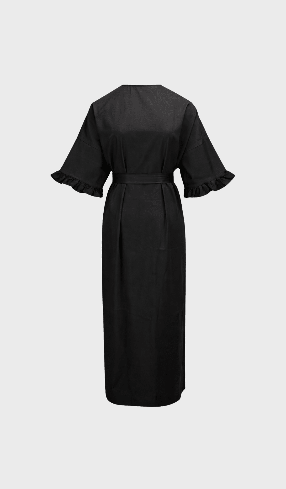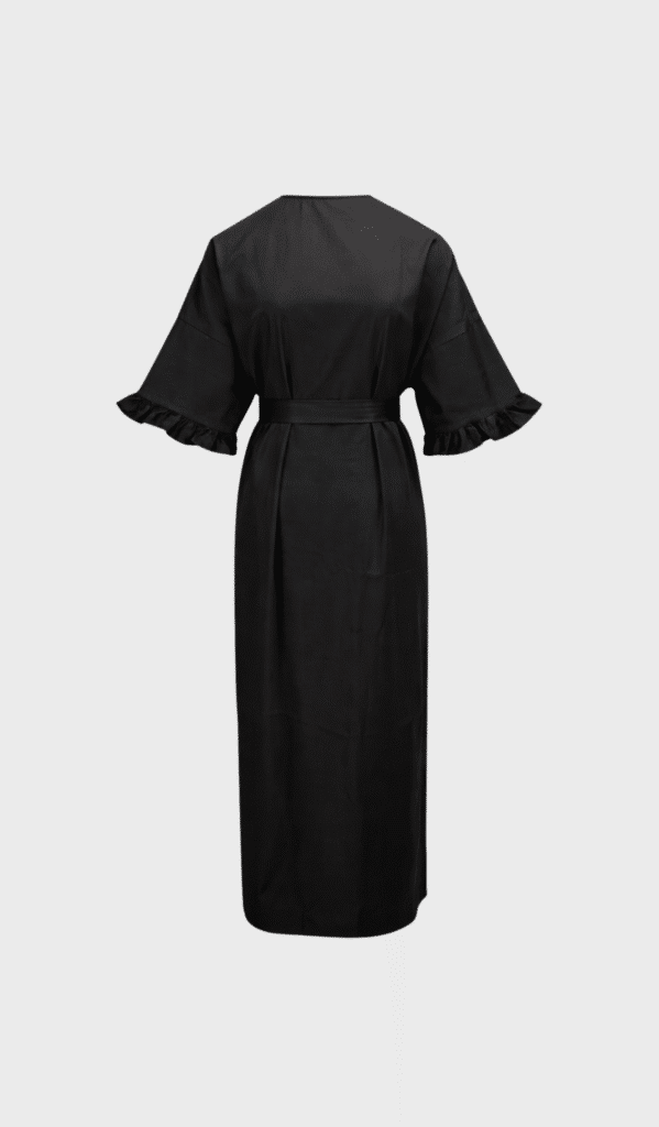 Long Oversized kaftan with round neck, blind zipper in the back, sleeves with ruffles, open split in the back and Self-tie belt.