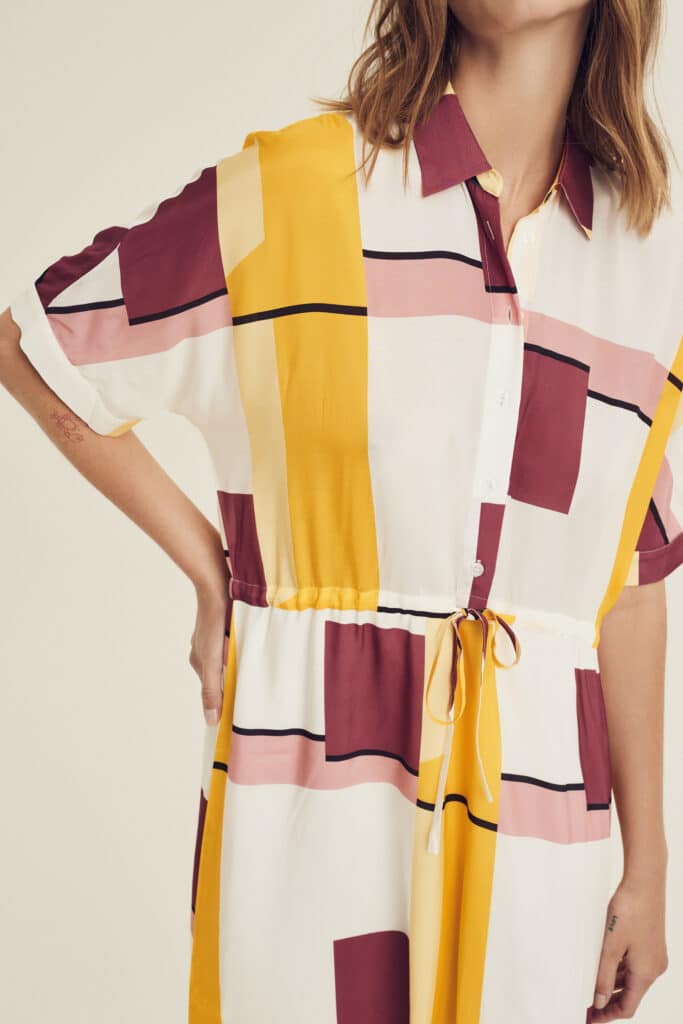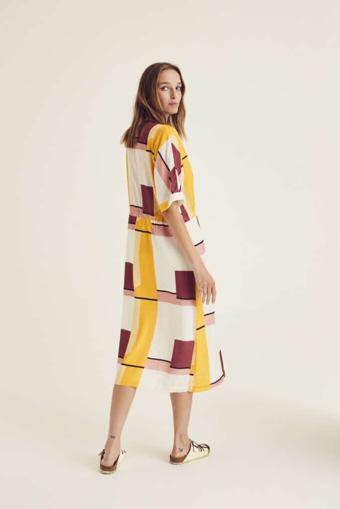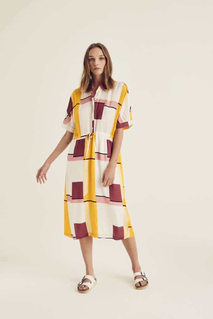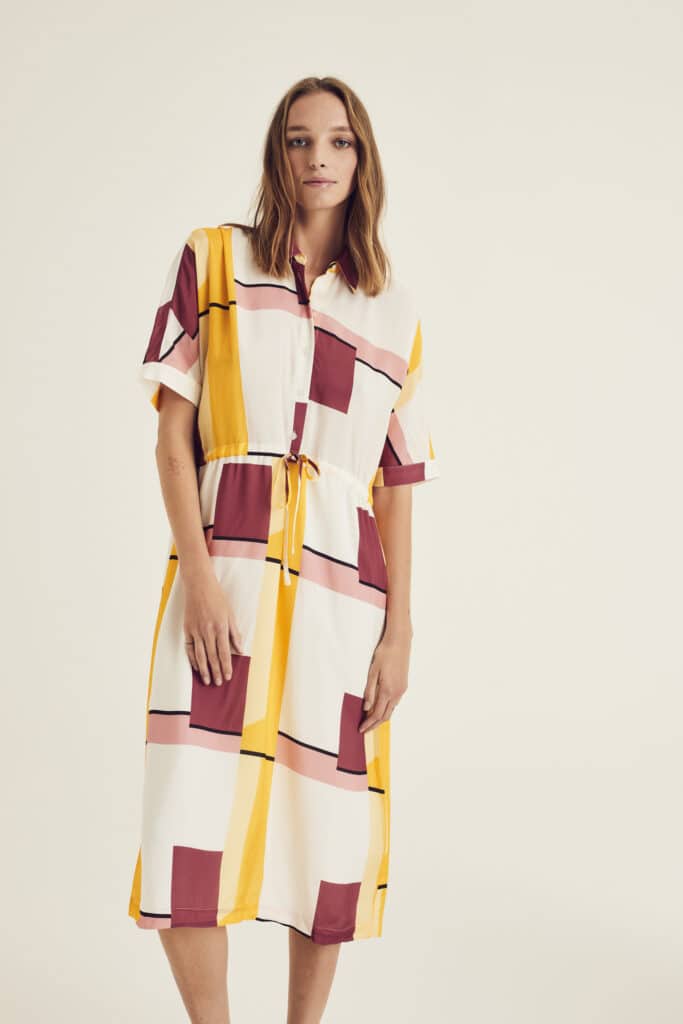 Panama is a geometric patterned midi dress with half-length sleeves and an integrated tie.