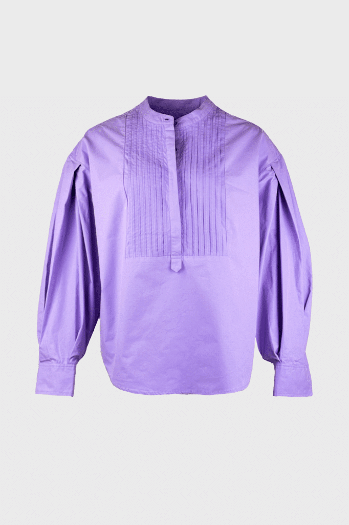 A chic purple blouse with a matching collar, accented by delicate pintuck detailing on the front.
