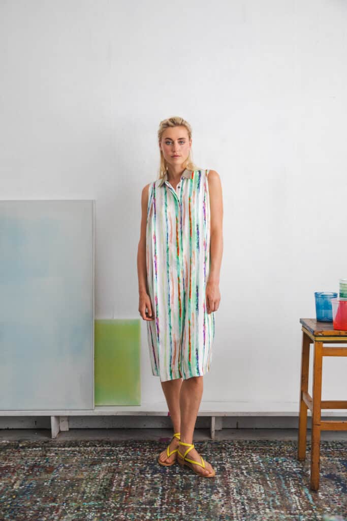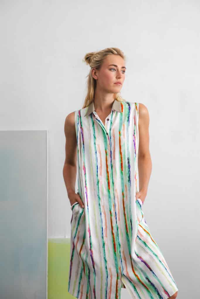 This midi dress is made from EcoVero with a colorful paint stripes print. The button-down design with hidden buttons ensures a polished look. The pleas at the shoulders add a touch of elegance, while pockets in the side seams offer convenience. Dress up or down for any occasion. This dress has a reversible and removable collar. The back of the collar is made in royal blue linen/viscose.