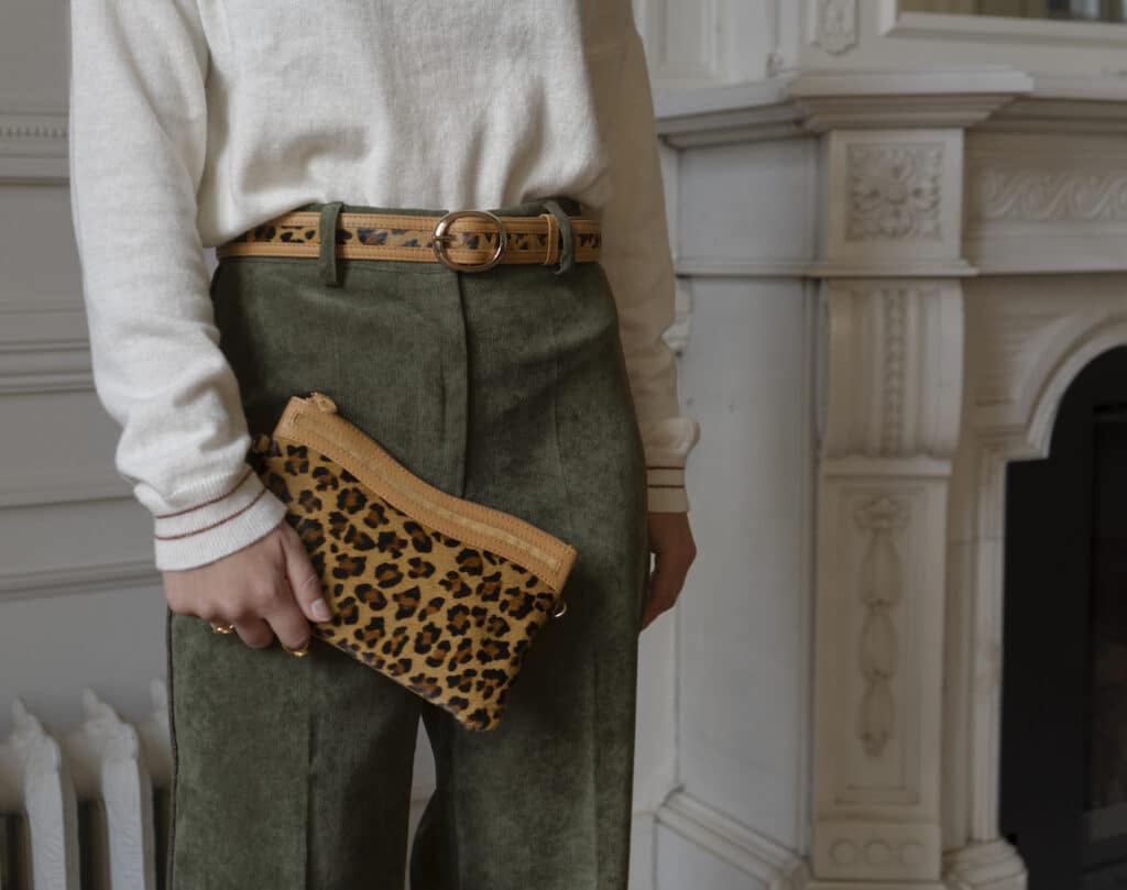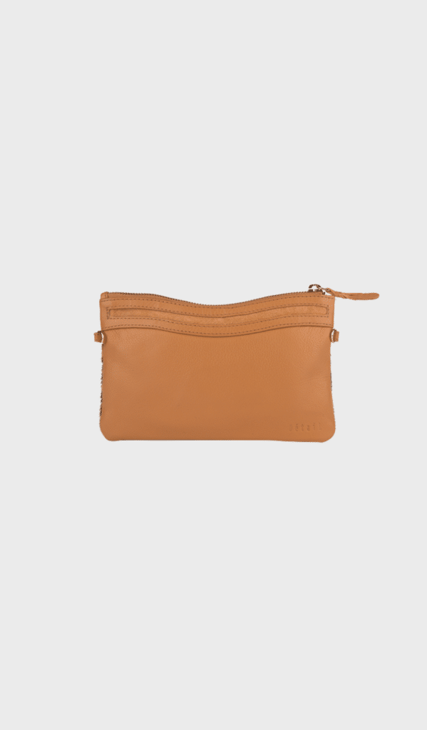 PURE by DétaiL is a camel brown colored leather clutch with leopard fur detail on front and both wrist strap and long strap available. Elevate your outfit to the next level of stylish with this clutch.