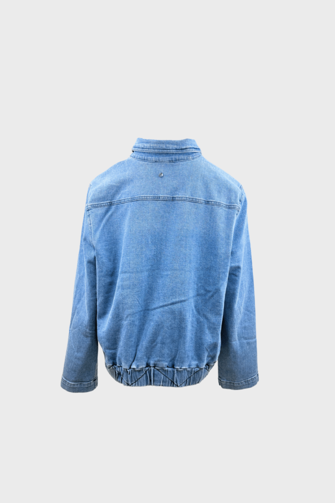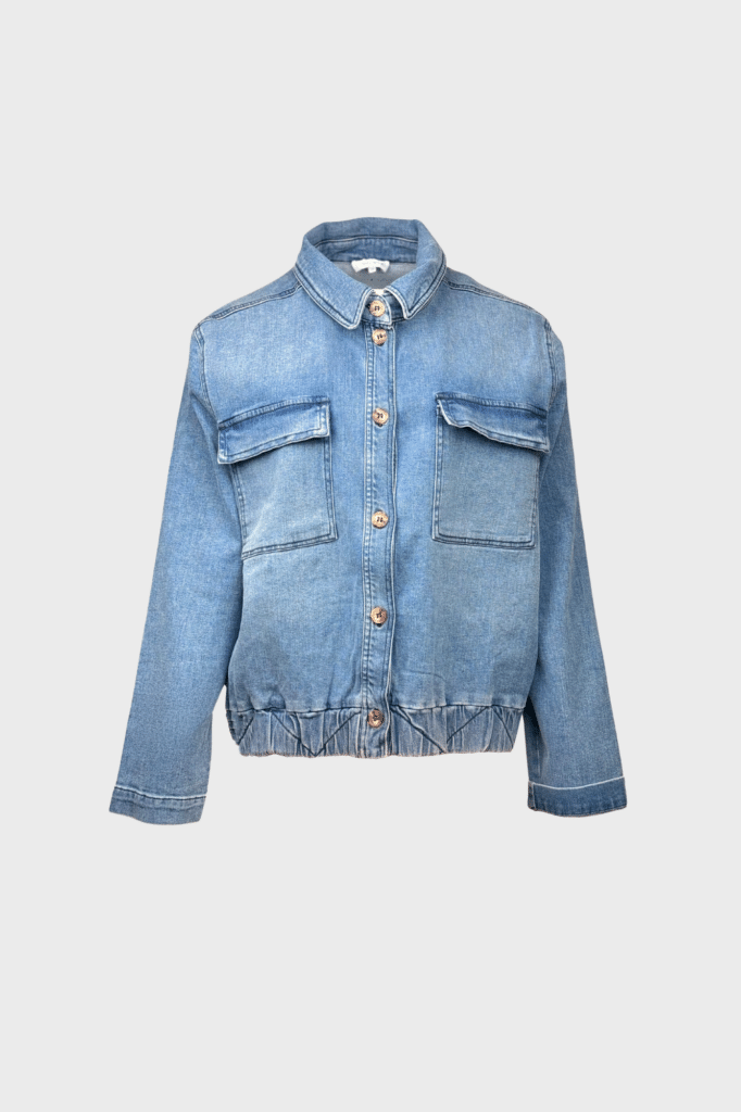 Denim jacket with button-down front, elasticated hem, and large pockets.