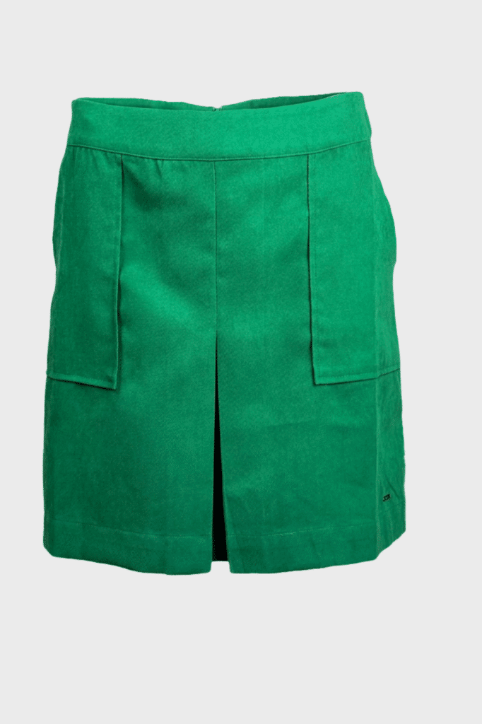 Green mini skirt with a structured fit, featuring a concealed back zipper for a seamless look.