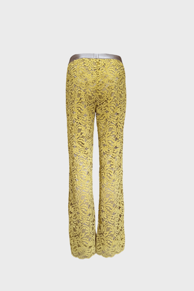 Yellow lace trousers with a semi-transparent design, elastic waistband, and tapered fit.