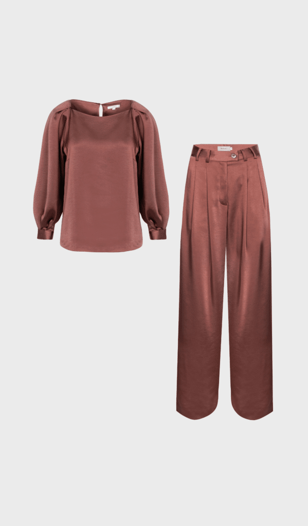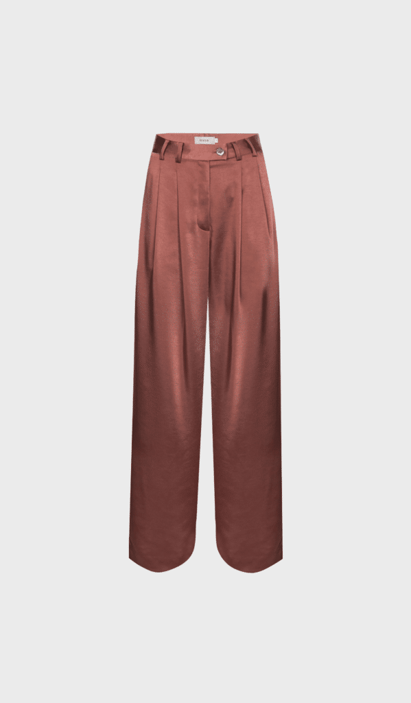 Riot by Gigue is a pair of long cassis brown colored pleated pants with belt hoops and pockets. Pair it with the matching blouse.