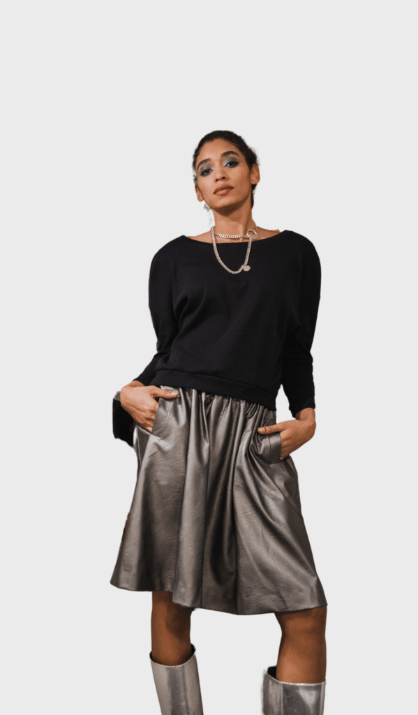This Sage mini skirt is stylish and modern. Made from vegan leather with an elastic in the waist and a black rope, it has two pockets and is sure to make a statement. Perfect for day or night, this piece adds a bold edge to any outfit.