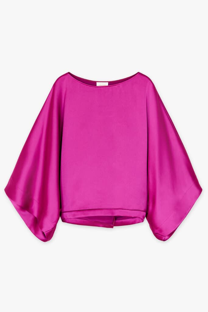 Ready to shine? This dark pink satin blouse with batwing sleeves and a wide neckline will add a stylish, glamorous touch to your outfit. Perfect for parties or special occasions where you want to make a fashion statement.