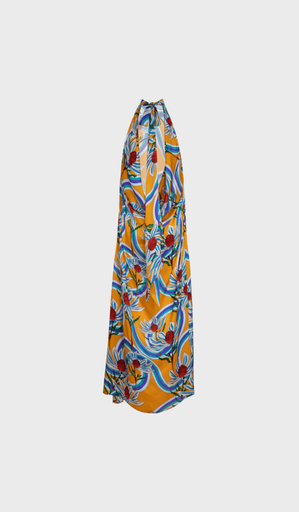 Satin Maxi Dress with Open Back | Halter Neck Sleeveless | Dark Yellow by Marylène Madou.