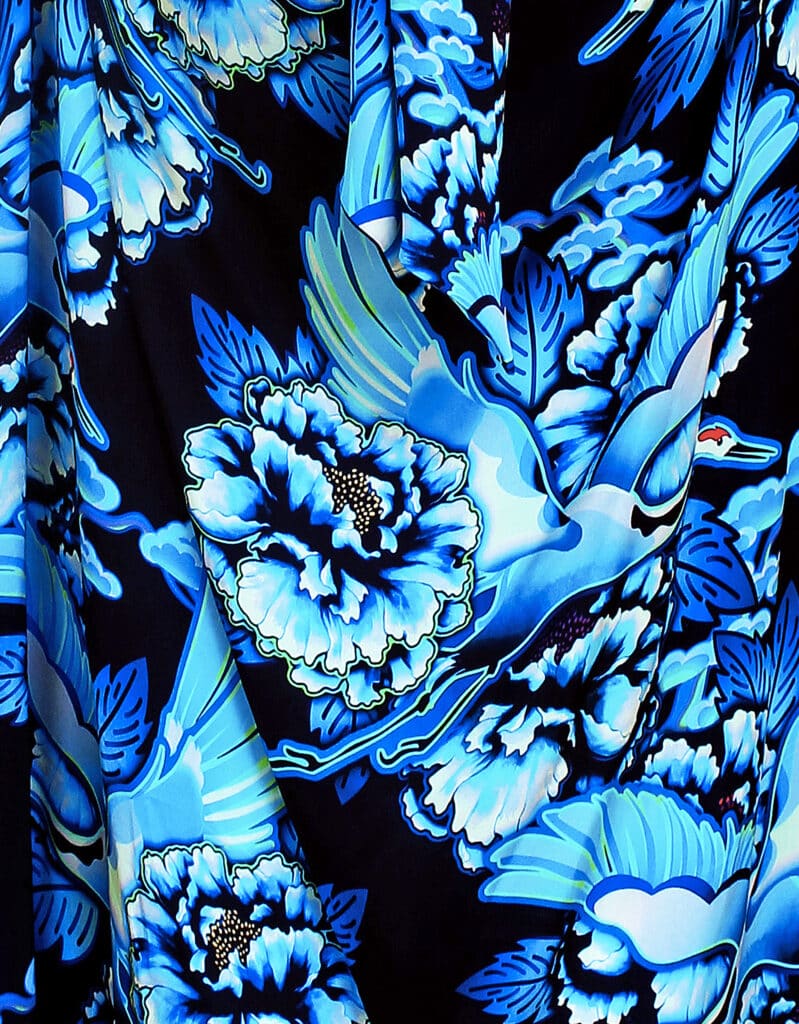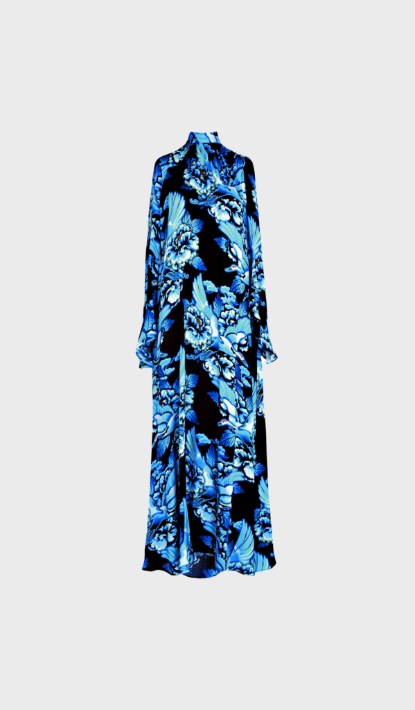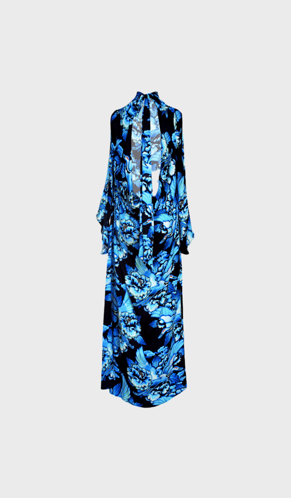 Satin Maxi Dress with Open Back | Long sleeve | Indigo Crane Birds by Marylène Madou.