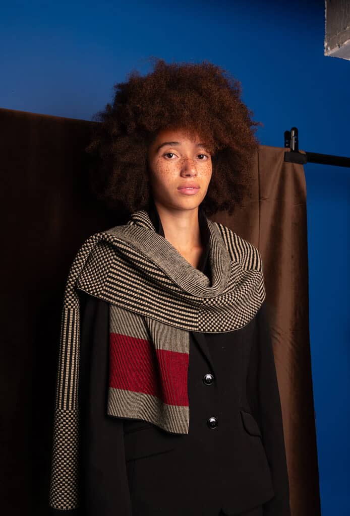 SCARF JACK by La Femme Garniture is a beige-black dual-colored thick scarf in a beautiful relief stitch with a strong graphic appearance. Wear it with a bold colored jacket or coat to elevate the look.