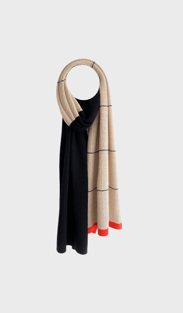 SCARF REINE by La Femme Garniture is a beige and black duo-colored scarf, in a flowing lace stitch with a graphic block pattern. Wear it with a bold colored jacket or coat to elevate the look.