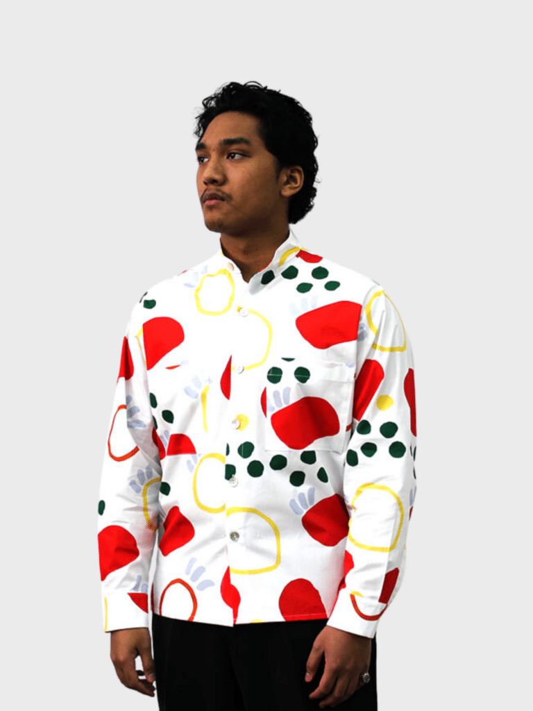 Bright shirt with two front pockets and buttons.