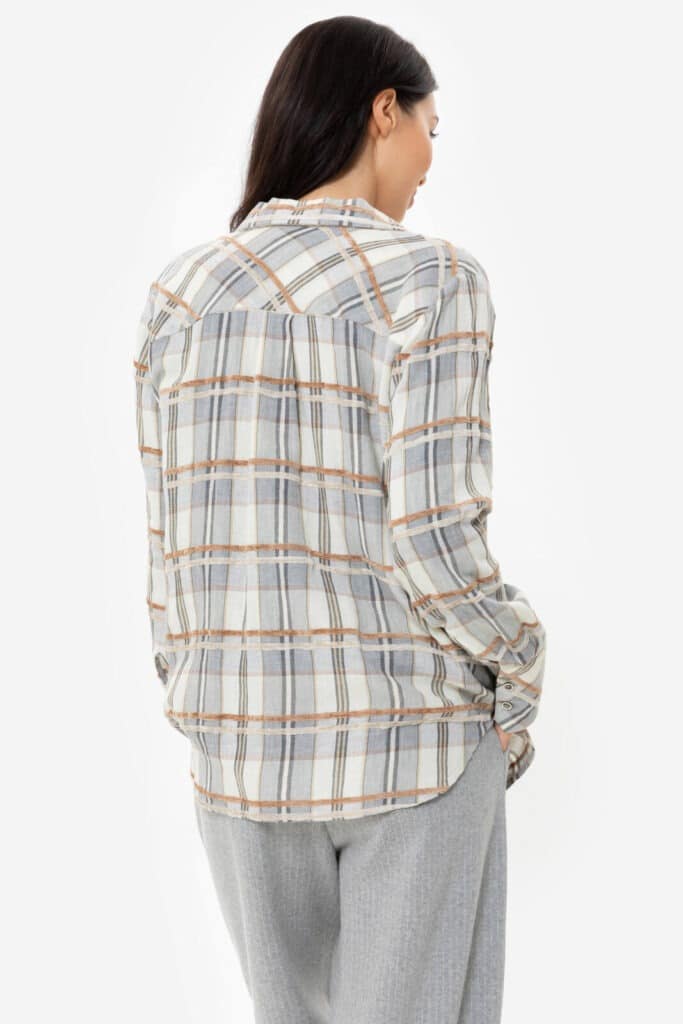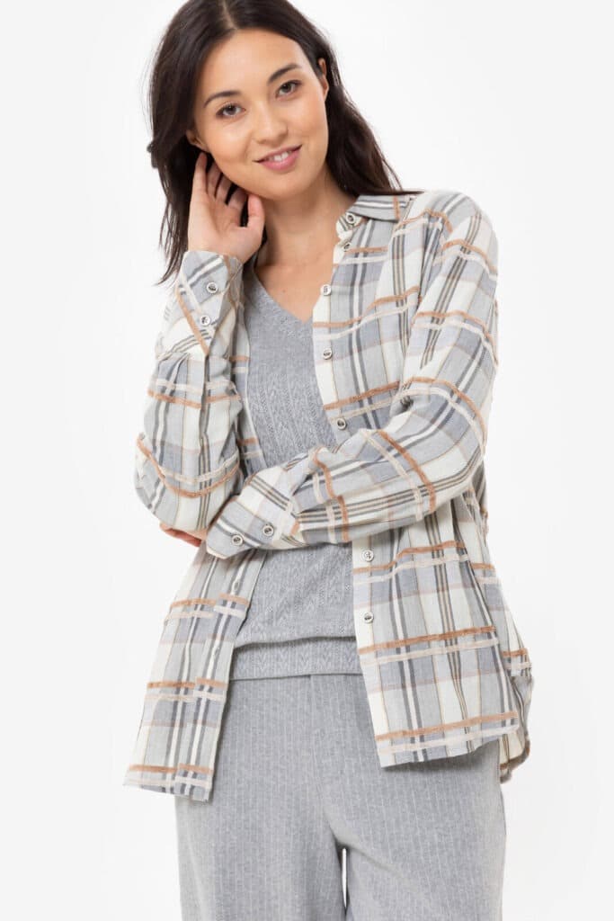 The Shonda blouse is a soft, grey flannel with brown and beige striped detailing