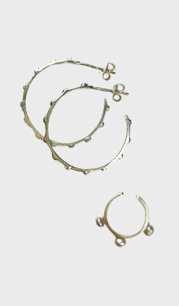 A set of two royal hoop earrings and a crown-like cuff earring with three pearls, both in recycled sterling silver.