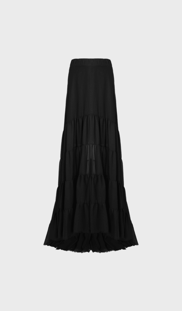 The Siren is a black skirt with long-tiered and ruffled chiffon with elastic waistband detail. This skirt will be a true eye-catcher in your wardrobe and will make you look stunning at each and every event.