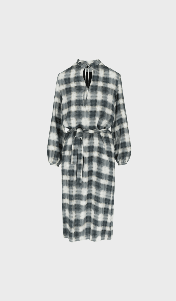 Sol Dress by Mon Col Anvers is a black checkered colored long straight dress with long sleeves, a split and pockets in the side seams. The dress has a loose belt and is made in a printed EcoVero and has a black lining.