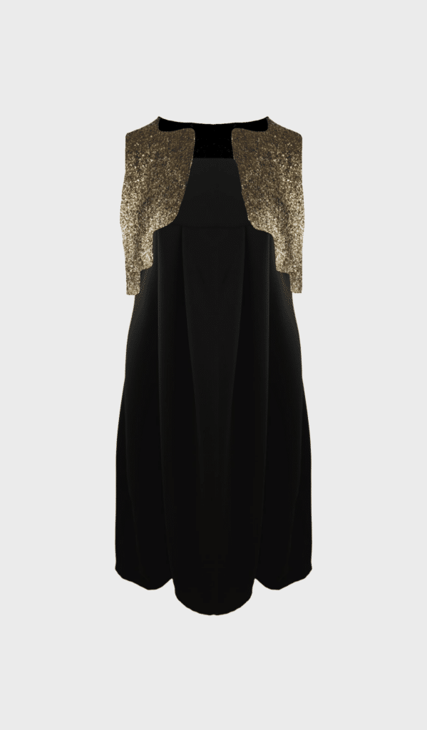 Evening dress with thin straps. Adaptable upper bodice and loose skirt section. Concealed zip in side seam. Unlined. This little black dress is combined with a gold sleeveless cardigan.