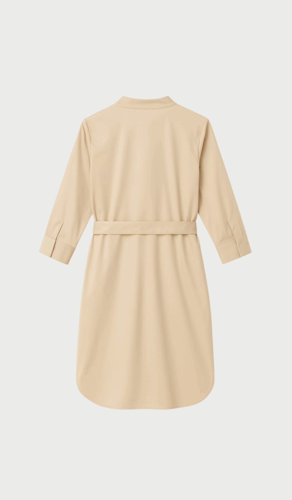 This shirt dress is completed with a matching detachable belt, a hidden button fastening that runs along the front and in-seam pockets. A wide standing neckline adds a sophisticated detail to this dress. It is available in black colour with 3/4 sleeves.