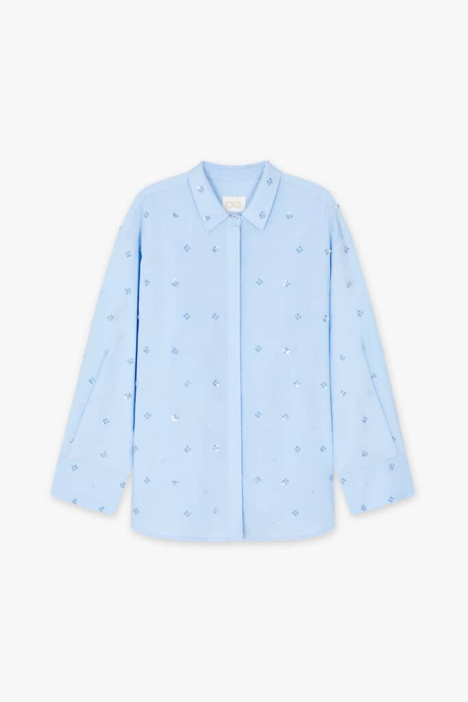This light blue cotton shirt for women is finished with embellishments in a floral pattern. This way this essential got a festive touch. This blouse has a shirt collar, wider cuffs and a blind row of buttons.