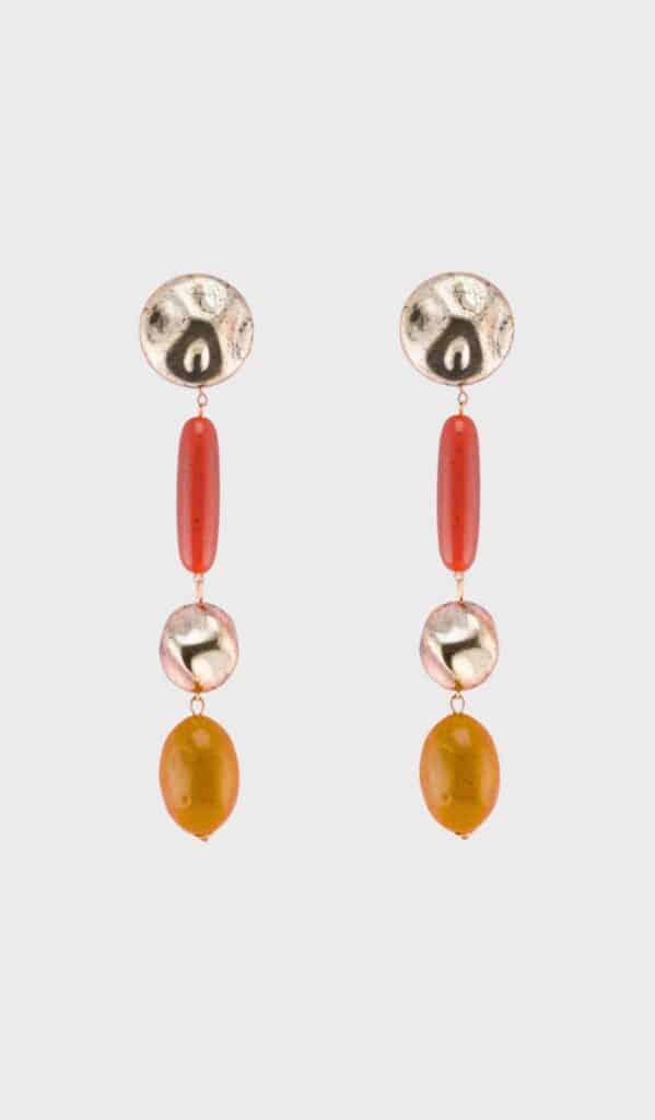 Suston Drop Earrings by LIVE TO EXPRESS is a red, gold and brown colored pair of exceptional large statement drop earrings. Which are designed and made in the 80s, but never worn before. Their design combines different unique elements, giving it that abstract yet powerful look.