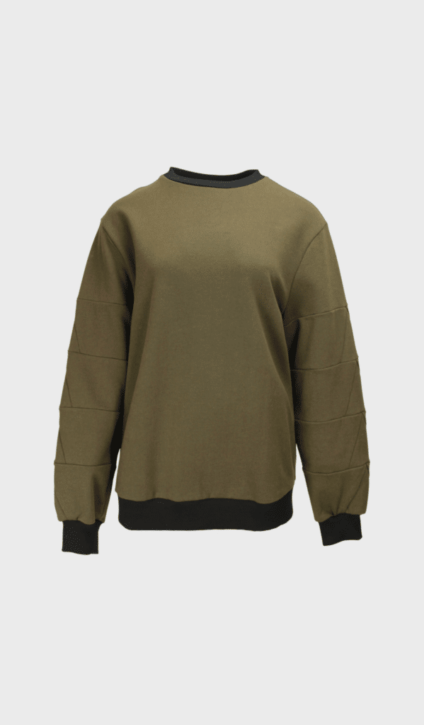 Sweater Plain by EVA Schalckens is a military green colored jumper with round neckline and long sleeves. Detailed geometric lines on the sleeves.