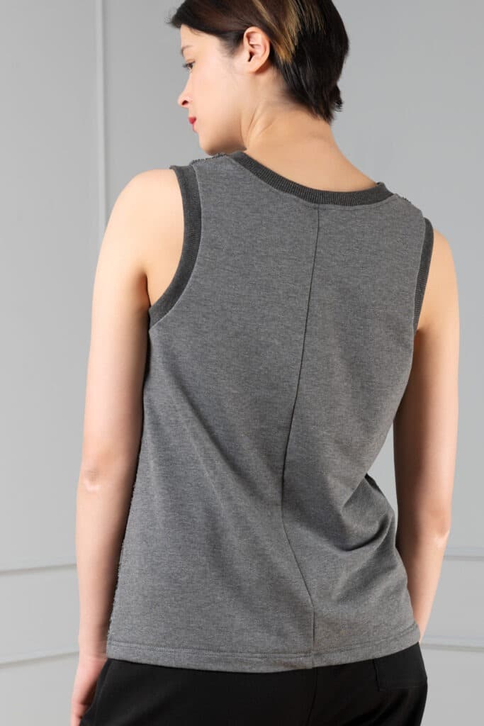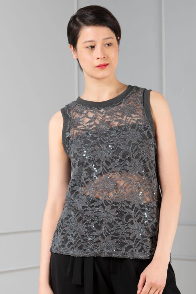Thialfi is a sleeveless tank top with all-around grey colored and floral motive lace and sequins. Mix it up with a pair of pants, jeans or skirt for a casual which look or a party/festival look.