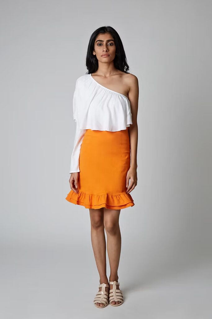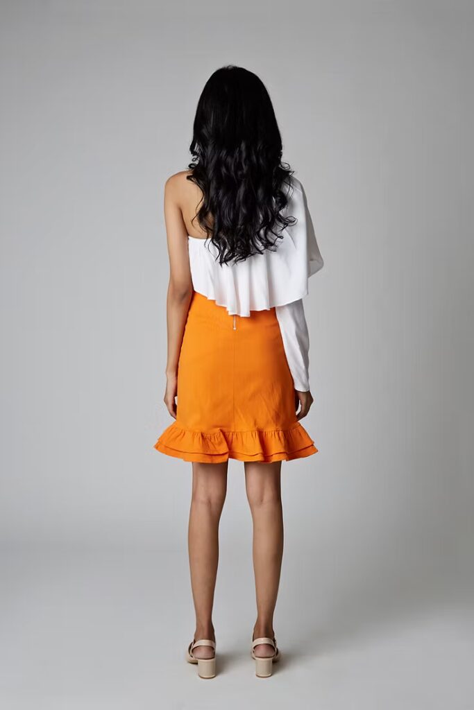The bright-coloured TIANA skirt is a must-have summer piece. The mini skirt is made of soft cotton/lycra fabric, comfortable from hip to hem. TIANA is fitted and has two-layered ruffles at the hem, fastened with a metallic zip at the back. Style the skirt with a cami top or a blouse to complete your look.