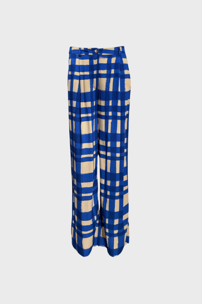 Wide-leg trousers with artistic check print, lightweight and breathable fabric.