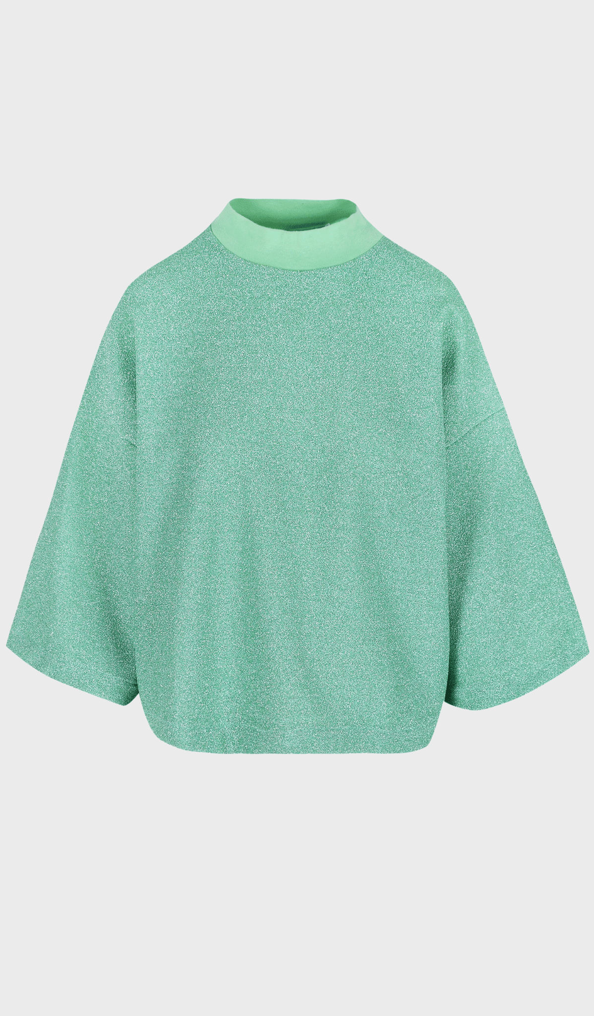 VESPER by Hampton Bays is a boxy fit in a fresh mint-green shade with a subtle glitter thread. Made from a viscose blend that feels light and comfortable on the skin, featuring a higher neckline and wide short sleeves.