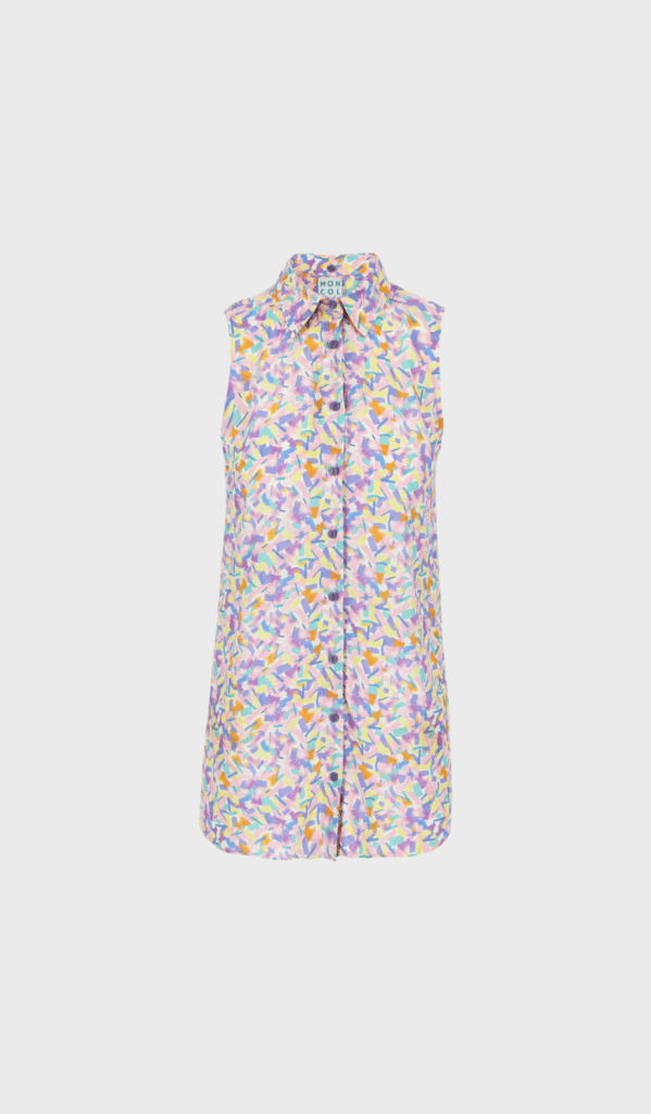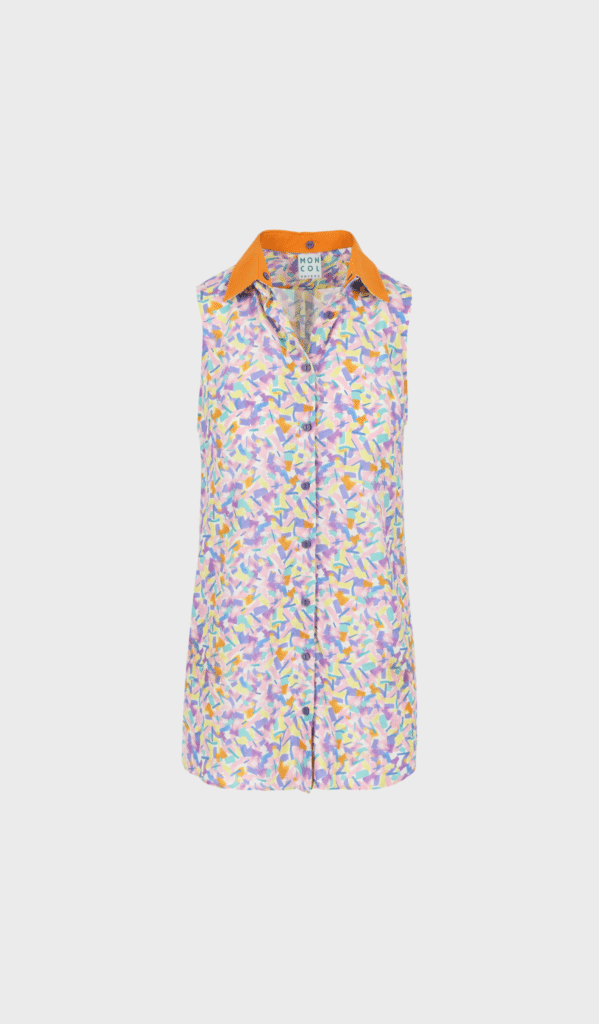 This loose en sleeveless blouse has a reversible and removable collar. The blouse is a bit longer so you can easily tuck it in or wear it open over a top. The blouse is made in a colorful printed EcoVero. The reverse collar is made in bright orange.