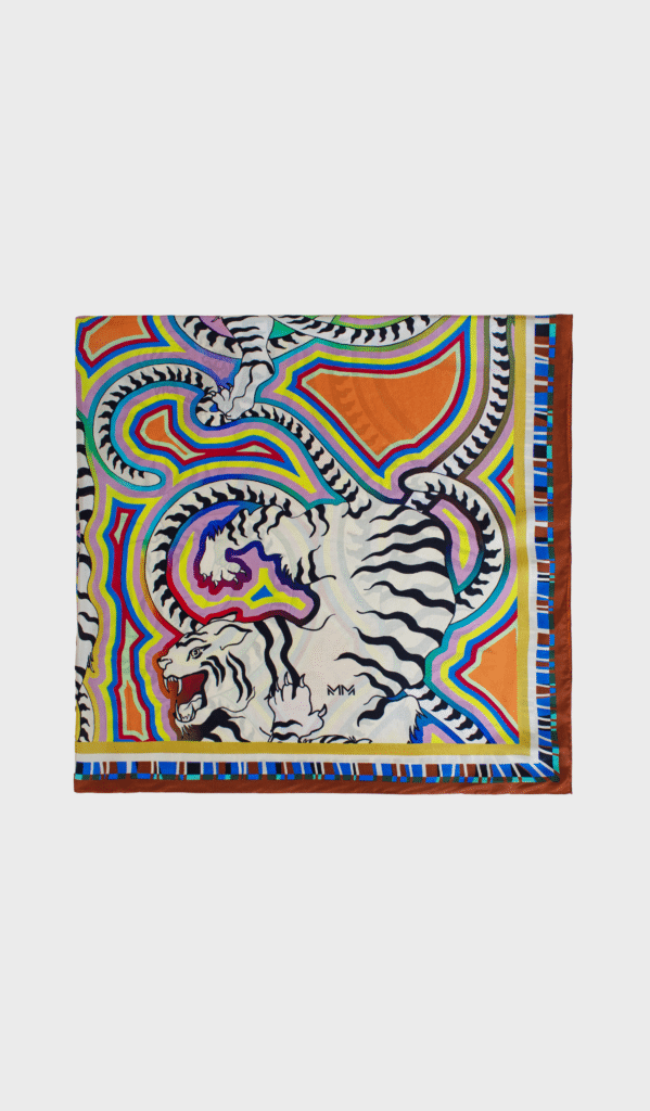 White Tigers Silk Dupion Maxi Scarf by Marylène Madou is an multi colored maxi scarf with detail of all over white tiger pattern print. Made in organic wild silk.