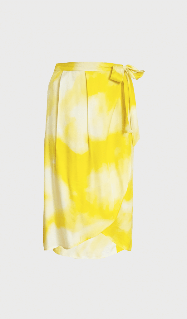 This elegant wrap skirt is a summer must-have! Wear it with a summer top or blouse, with heels, sandals or sneakers and you’re good to go. The skirt closes with a button on one side and with a knot on the other. The fabric is a FSC certified viscose with yellow splash print.