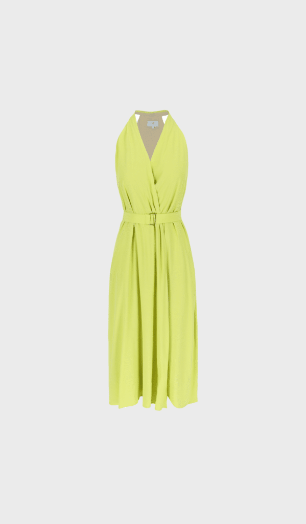 This effortlessly chic summer dress is made of Ecovero and rayon for ultimate comfort, featuring a belt to allow it to be worn open or closed. The lime color and beige lining add a pop of style, while the side pockets offer practical convenience. It’s perfect for any occasion and is sure to make you look your best.