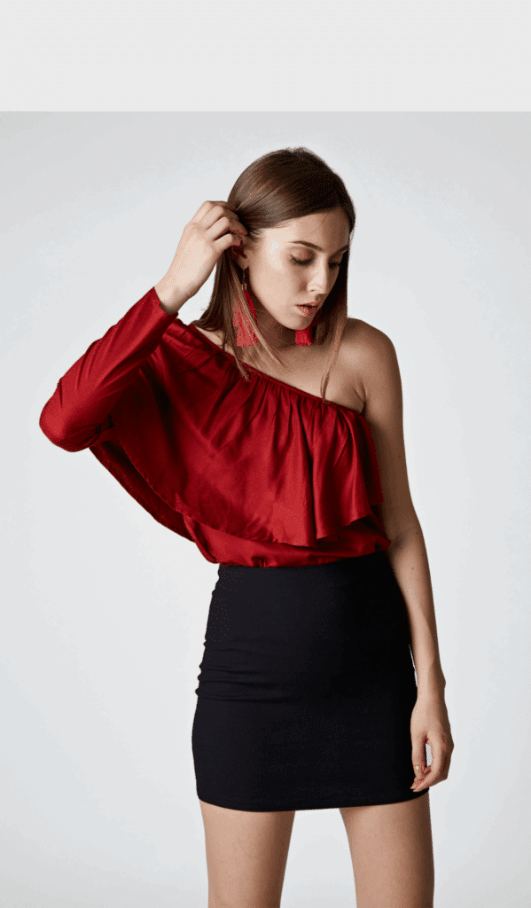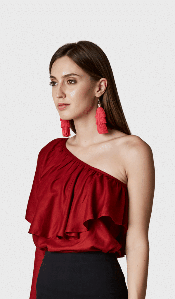 Be the diva this season with ZIBA one-shoulder blouse in moss woven fabric. The top has ruffles and one long sleeve. Pair it with flared trousers or jeans and accessorized with earrings to complete your summer look.