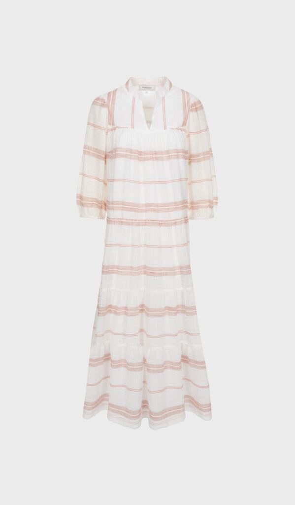Zimbabwe by Terre Bleue is a white and copper striped long dress with relaxed fit. Korean collar, deep V-neckline and puffed mid sleeve length.